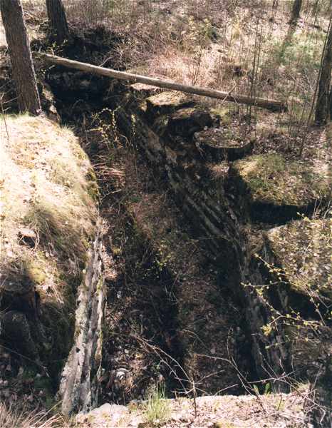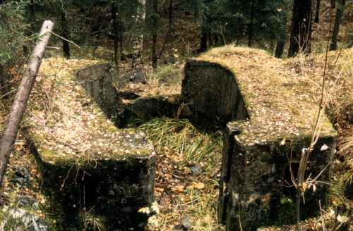 A small observation post which was maybe also used as a riffle firing position. Roof was destroyed when the steel balks were blown out for scrap metal after the war. Maununneva. (1998)