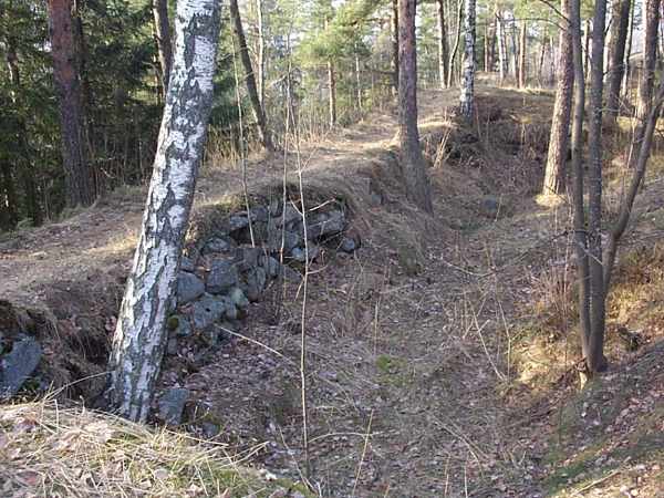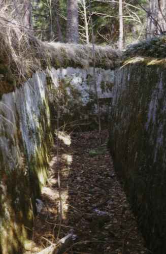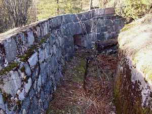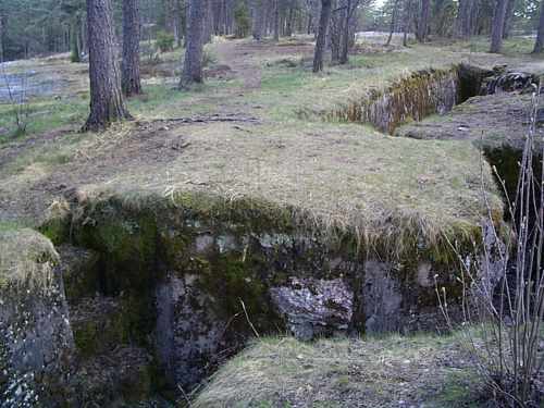 In the beginning of year 1915 built the first permanent fortifications. Wood and stone blocks were the most important building materials before implementing the use of concrete. A trench and recess for ammunition are reinforced using stone wall in Pajamäki. (2000)