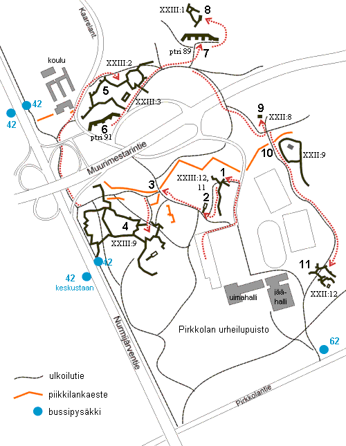 Lähtöpaikka on Pirkkolan urheilupuiston uimahallin parkkipaikka. Suositeltu reitti on merkitty punaisilla nuolilla. Karttaan ei ole merkitty kaikkia urheilupuiston alueella kulkevia teitä.